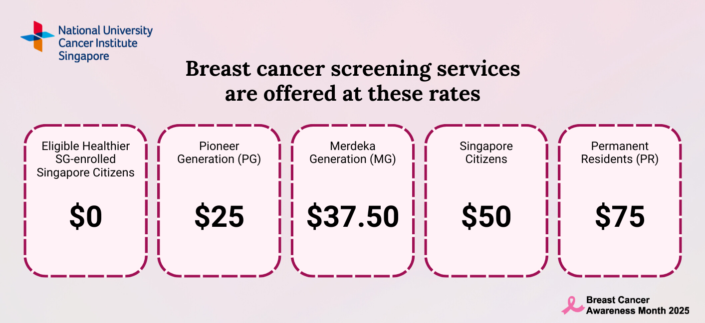 Free mammogram screening is available for Singaporeans enrolled in HealthierSG. For more details on HealthierSG enrolment, please visit HealthierSG Enrolment.