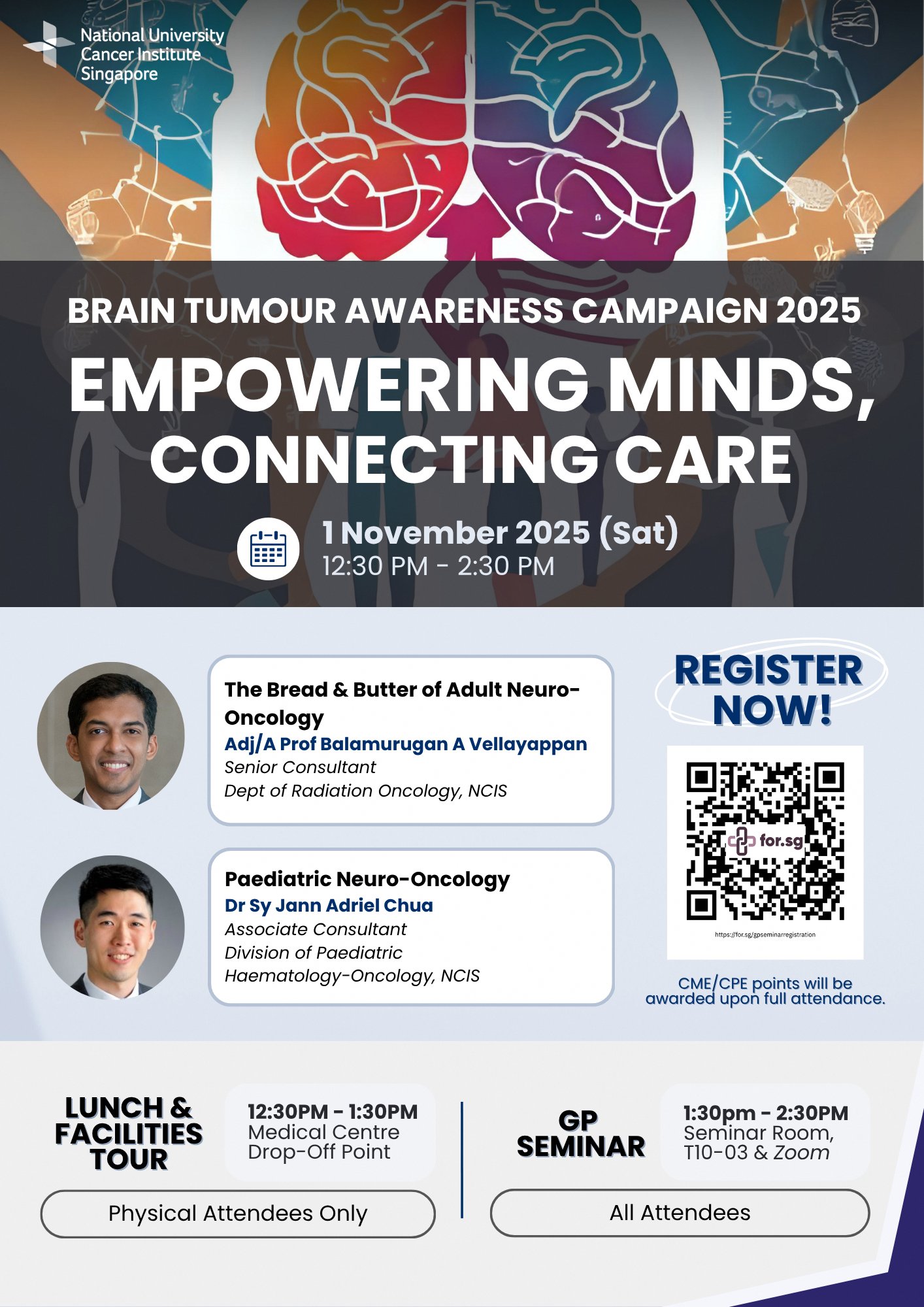 Join us for an informative GP seminar as part of Brain Tumour Awareness Month Campaign 2025. This hybrid event will feature two distinguished speakers presenting on key topics related to brain tumour care and management, followed by an interactive question and answer session to address your clinical queries. Other than that, physical attendees will go on an exclusive guided tour of the state-of-the-art radiation facilities at the NUH Medical Centre, providing valuable insights into the latest treatment technologies available for brain tumour patients. Whether you attend in person or join us virtually, this session offers an excellent opportunity to enhance your knowledge and stay current with developments in brain tumour diagnosis and treatment.