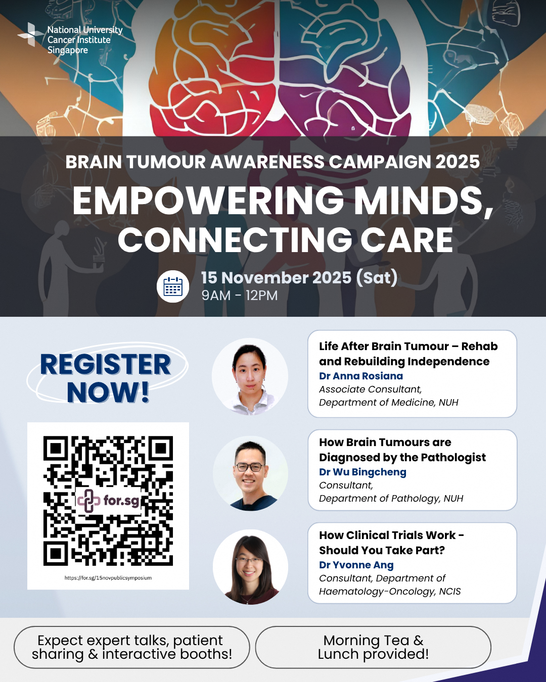 Join us for the Public Symposium as part of Brain Tumour Awareness Month Campaign 2025. The programme begins with a mindfulness workshop and opening speech, followed by social support sharing sessions and hear inspiring patient stories from 2-3 speakers to foster deeper understanding and community connection. This inclusive event aims to bring together healthcare professionals, patients, caregivers, and the wider community to share knowledge, experiences, and support in the journey of brain tumour awareness and care.