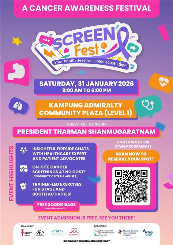 Organised annually by SCS to mark World Cancer Day, this flagship event brings together the public, private and people sectors to promote cancer prevention through community screening, vaccination, and education. In line with Healthier SG, Screen Fest will provide individuals an opportunity to take charge of their health, by learning more about cancer screening and early detection. With a strong partnership with SCS, NCIS will be one of the participating collaborators, introducing self-examination techniques to you!