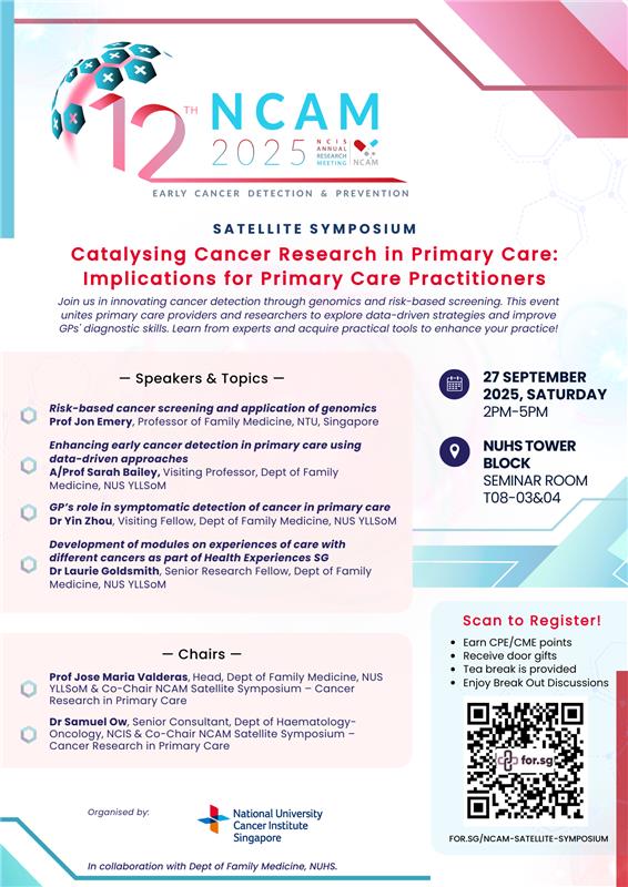 | 2:00pm - 2:05pm | Opening Address Prof Jose Maria Valderas Head, Dept. of Family Medicine, NUS YLLSoM Co-Chair NCAM Satellite Symposium - Cancer Research in Primary Care |