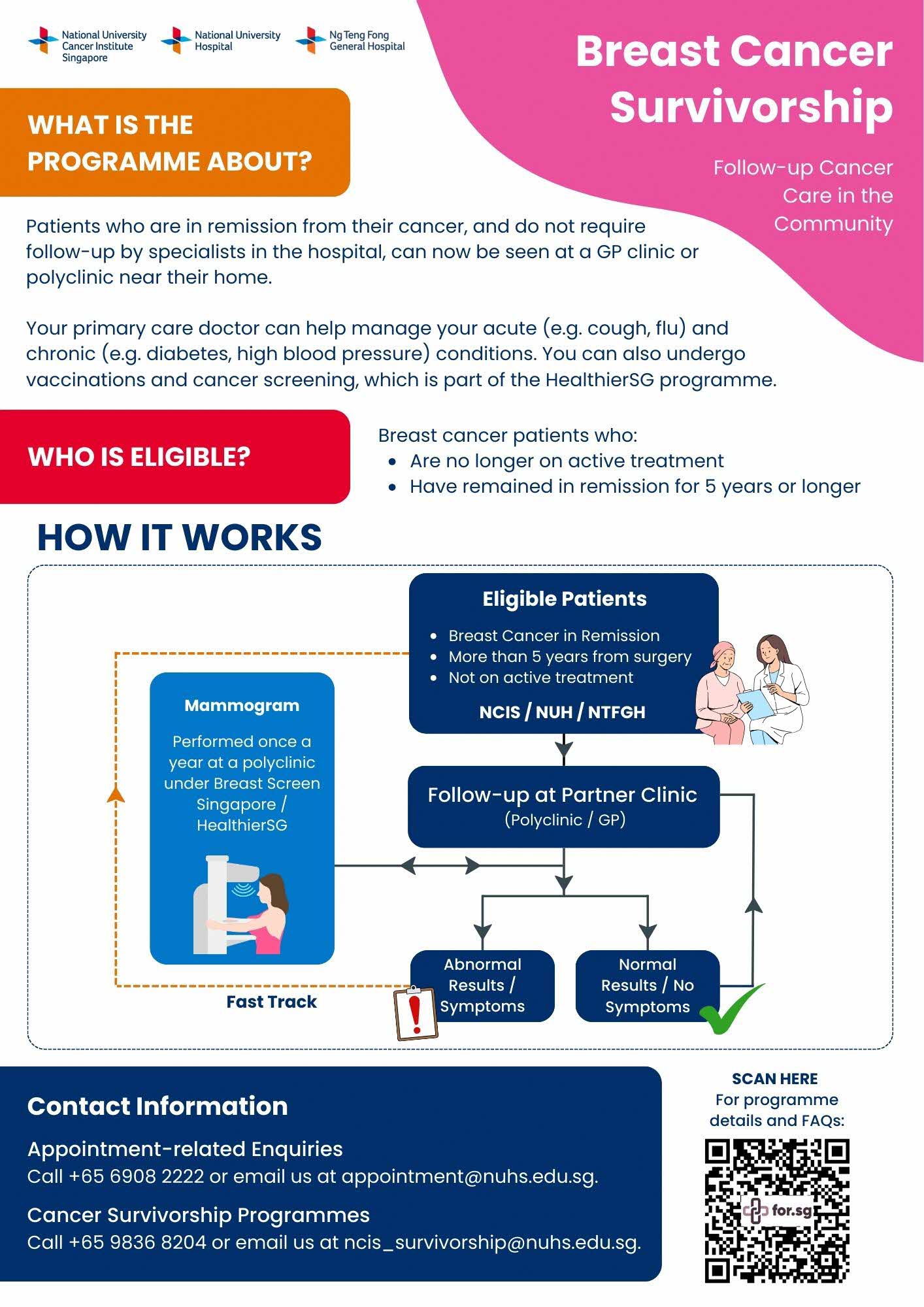 You will have your annual follow-up with your primary care provider and fast track back to NUH for further assessment, if abnormal results are being detected in your annual screening mammogram. Subsidised annual mammogram will be done under Breast Screen Singapore (BSS) in one of the National University Polyclinics. Non-subsidised annual mammogram will be done in NUH.